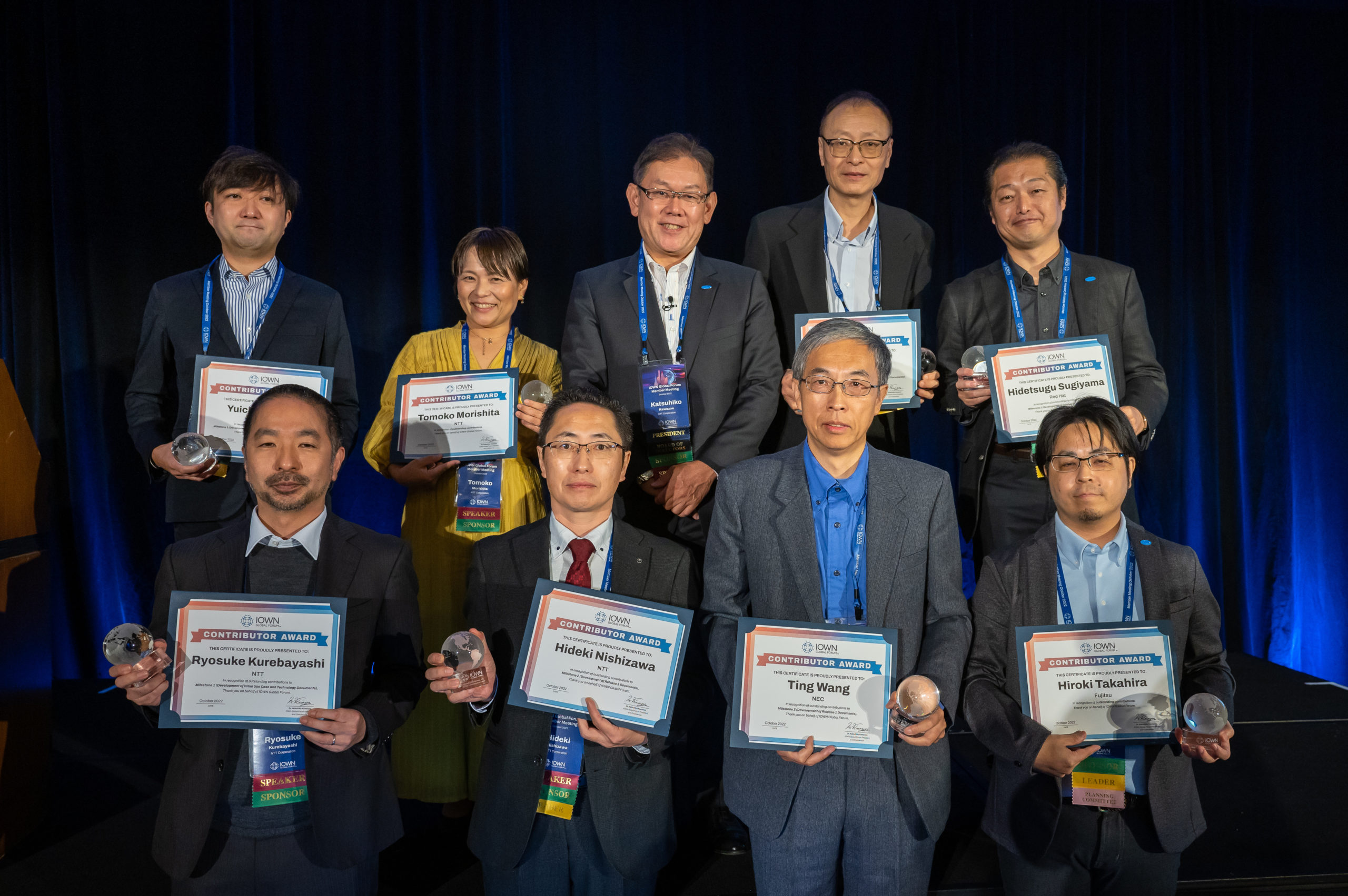 Eight members of the IOWN Global Forum were recognized for their tremendous work towards the development of initial use case and technology documents, the development of release one documents, and outstanding contributions in other areas. The award winners were: