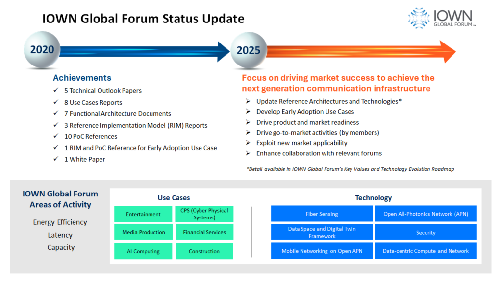 The IOWN Global Forum was founded in 2020 to lead the development of high-capacity, ultra-low latency, and power-efficient photonics-driven technology, designed to provide new services, foster sustainability, and address societal needs worldwide. To celebrate this important milestone of five years of work, the Forum has released a snapshot